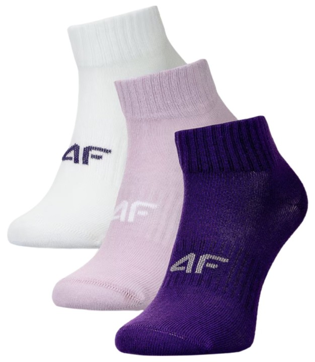 Girls' socks are the ideal choice for everyday activities. Thanks to the use of soft and elastic fibres, they adapt to the shape of the foot for comfort. They have a length above the ankle. They are made of 73% cotton, which makes them soft, durable, and pleasant to the touch. The addition of polyamide (24%) makes the material more resistant to stretching and creasing. Everyday socks with the 4F logo on the midfoot. Multipack: 3 pairs included. Cotton socks for girls are made from an elastic material that fits closely to the foot. They have non-compressive cuffs that keep the sock in the correct position.